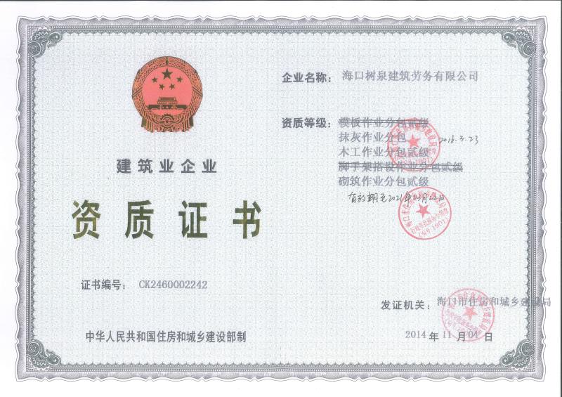 海口樹泉建筑勞務有限公司成立于2011年,公司位于???,其前身是一家專業建筑施工隊,自2004年即開始在海南從事建筑勞務施工。自成立至今,公司已經擁有一支科學管理、質量過硬、能打硬仗,搶工期的專業隊伍。能獨立承擔大中型工業與民用建筑 、室內外裝修、各類機電設備安裝工程。代表工程有海口濱海華庭、三亞時代海岸T01/02/04/05棟高層、合肥東?;▓@二期、陵水富力灣B區高層、三亞金中海(酒店)、瓊海大印經典花園、海口環球海景大酒店(四星級酒店,在建中)、陵水珍珠大廈(五星酒店)、??谌f達廣場、美蘭機場二期。